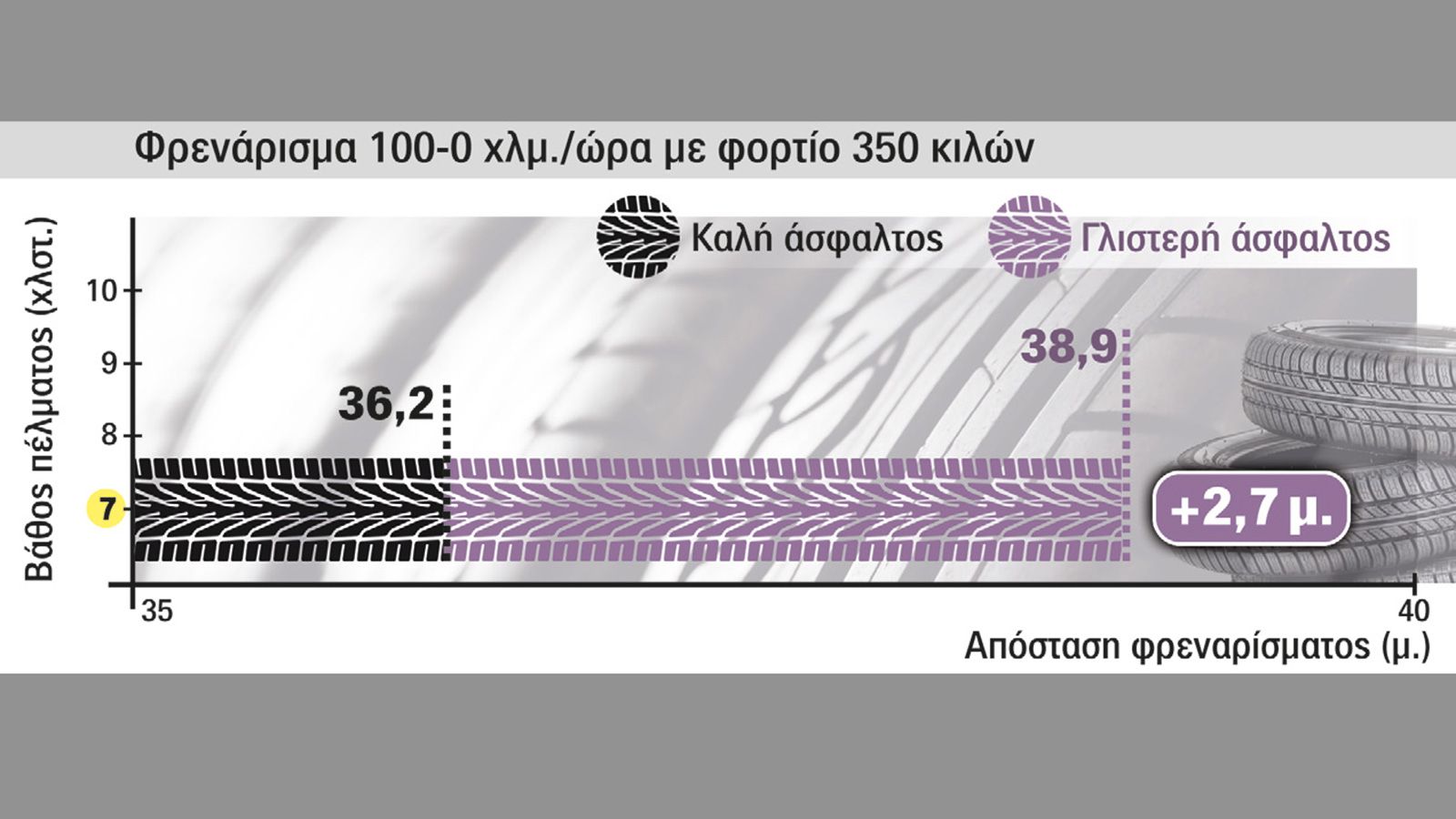 Μετρήσαμε τις επιδόσεις φρεναρίσματος σε καλή άσφαλτο με καλά ελαστικά και βάρος 350 κιλών (4 επιβάτες+αποσκευές). Όπως φαίνεται στο σχετικό διάδραμα και εδώ είχαμε αύξηση στο φρενάρισμα, σε σχέση με τις αντίστοιχες επιδόσεις χωρίς φορτίο. Μπορείτε να φανταστείτε τι γίνεται λοιπόν όταν φρενάρει κανείς φορτωμένος, με χάλια ελαστικά σε γλιστερή άσφαλτο…