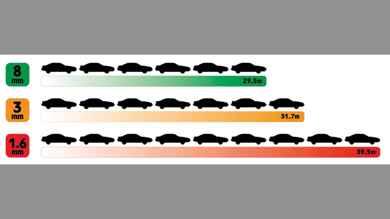 Δοκιμές που έχουν πραγματοποιηθεί από την ένωση ερευνών της αυτοκινητοβιομηχανίας (Motor Industry Research Association, MIRA) επάνω σε τέσσερα διαφορετικά αυτοκίνητα που κινούνται με 80 χλμ./ώρα σε βρεγμένο δρόμο και με τρία διαφορετικά βάθη πέλματος κατέδειξαν ακόμη μεγαλύτερες διαφορές στο φρενάρισμα, όπως μπορείτε να δείτε και στο παρακάτω γράφημα.