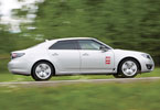 Δυναμικές γραμμές και αρμονικές καμπύλες χαρακτηρίζουν την εξωτερική εμφάνιση του νέου Saab 9-5. Ξεχωρίζουμε από το πλάι τη φαρδιά και κεκλιμένη πίσω κολόνα, που προσθέτει έντονο χαρακτήρα στο σουηδικό μοντέλο.