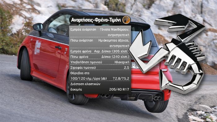 Η σκληρή ανάρτηση του 595 Competizione (πιο κοντά ελατήρια, σφιχτότερα αμορτισέρ KONI FSD και αντιστρεπτική) ορίζει μεγάλα περιθώρια πρόσφυσης και αμεσότητα όσον αφορά στις ενέργειες του οδηγού. Θα μπορούσε να πει κανείς ότι θυμίζει ένα καρτ που αρέσκεται στο στεναδούρι, αφού ο οδηγός μπορεί να κινηθεί εξαιρετικά γρήγορα και «παιχνιδιάρικα» όταν αυτός το επιθυμεί. Μάλιστα, στην χειροκίνητη έκδοση διαθέτει (προαιρετικά και το προτείνουμε ανεπιφύλακτα) μηχανικό διαφορικό περιορισμένης ολίσθησης (Abarth D.A.M.), το οποίο βελτιώνει το πάτημα και τη μετάδοση της ροπής στους εμπρός τροχούς κατά τη διάρκεια στροφών, ενώ στην αυτόματη το TCT (ηλεκτρονικό μπλοκέ μέσω του ESP) που λειτουργεί και αυτό πολύ καλά επαναφέροντας στην τάξη το μικρό αμάξωμα και αυξάνοντας τη σταθερότητά του, το οποίο όμως συμπεριφέρεται λίγο άτσαλα σε μέτρια άσφαλτο λόγω και του μικρού μεταξονίου. Φυσικά, την αγωνιστική αίσθηση ολοκληρώνει το καλό σε αίσθηση -σχετικά μεγάλο όμως σε διάμετρο- τιμόνι (στην επιλογή Sport τουλάχιστον), καθώς και τα δυνατά φρένα με 4πίστονες δαγκάνες της Brembo που ανταποκρίνονται ακόμη και μετά από έντονη και συνεχή χρήση.