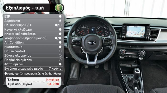 Όπως αναφέραμε και στην αρχή, τα πράγματα στην κατηγορία Β έχουν δυσκολέψει για τα καλά, αφού κάθε νέο μοντέλο που παρουσιάζεται είναι καλύτερο από αυτό που παρουσιάστηκε αμέσως προηγουμένως. Παρόλα αυτά, το Kia Rio φαίνεται να αντέχει και να μην μένει πίσω από τις εξελίξεις. Δεν έρχεται για να κατακτήσει την κορυφή, όμως τα πάει αρκετά καλά. Πιο αναλυτικά, στο εσωτερικό του παρατηρούμε το ίδιο σχεδιαστικό μοτίβο με το εξωτερικό καθώς συναντούμε έντονες γραμμές και καμπύλες, οι οποίες δίνουν στο κορεάτικο μικρό την αίσθηση μεγαλύτερων διαστάσεων. Αναφορικά με την εργονομία δεν έχουμε κανένα παράπονο –είναι καλή θα πούμε παρά τους αρκετούς διακόπτες στο τιμόνι, ενώ όσον αφορά στην ποιότητα των υλικών θα θέλαμε καλύτερα υλικά σε κάποια σημεία. Η συναρμογή από την άλλη είναι καλή. Τέλος, άξια αναφοράς είναι η μεγάλη οθόνη αφής 5 ή 7 ιντσών (προαιρετικά) ψηλά στο κέντρο του ταμπλό, η οποία έχει καλή ευκρίνεια, εύκολο interface (από εκεί χειρίζεσαι ηχοσύστημα, navi κτλ.), ενώ έχει πλήρη συνδεσιμότητα με Android και Apple συσκευές (σ.σ. δεν θα μπορούσε βέβαια να γίνει διαφορετικά, εφόσον το Rio θέλει να διευρύνει το κοινό του!). Απλός και ευανάγνωστος είναι και ο πίνακας οργάνων, ενδιαφέρον παρουσιάζουν οι αεροπορικού τύπου διακόπτες για το κλιματισμό, ενώ μας άρεσαν ο χώρος για μικροαντικείμενα και το ραφάκι για ένα μεγάλο σε ίντσες smartphone μπροστά από τον επιλογέα, όπως και ότι υπάρχουν θύρες USB και πίσω.
