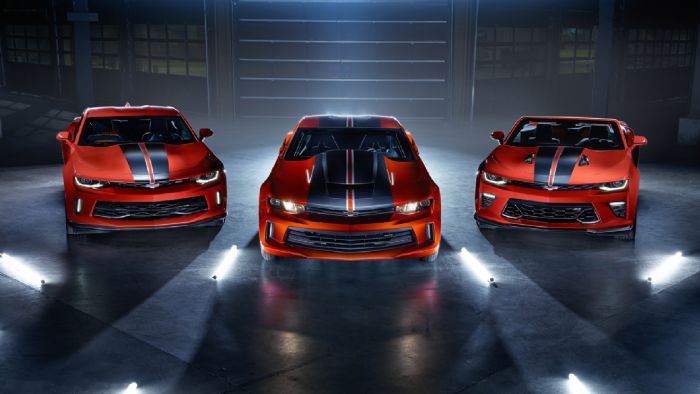 Η General Motors θα παρουσιάσει στο τέλος του μήνα στην έκθεση SEMA τη νέα Chevrolet COPO Camaro (κέντρο), αλλά και την Camaro Hot Wheels 50th Anniversary Edition (αριστερά – δεξιά).