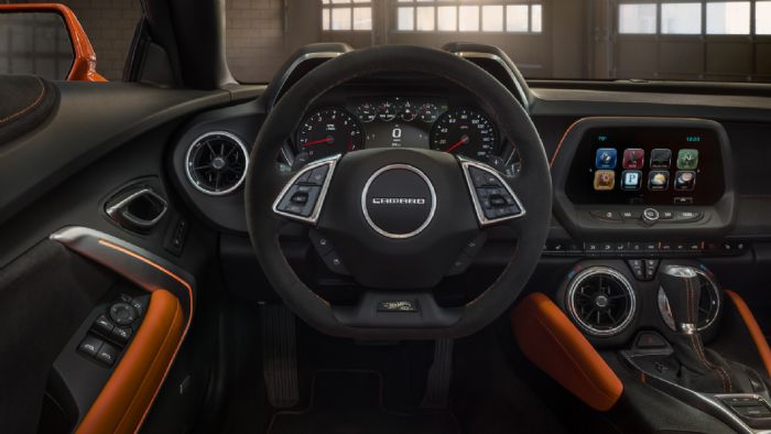 Στο εσωτερικό υπάρχουν μαύρες δερμάτινες επενδύσεις με πορτοκαλί λεπτομέρειες. Τα μαρσπιέ είναι φωτιζόμενα, τα πατάκια είναι διαφορετικά, ενώ στο τιμόνι υπάρχει το σήματα «50th Anniversary Hot Wheels».