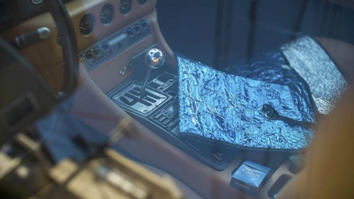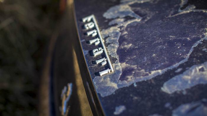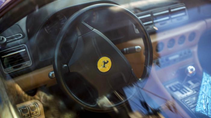 Εντούτοις, το εσωτερικό βρίσκεται σε πολύ καλή κατάσταση, εν αντιθέσει με το διαβρωμένο εξωτερικό. Πιο συγκεκριμένα το ταμπλό φάινεται να βρίσκεται σε άριστη κατάσταση, όπως επίσης και το τιμόνι, στο κέντρο του οποίου δεσπόζει το έμβλημα της Scuderia Ferrari σε κίτρινο φόντο. Περιέργεια προκαλεί το γεγονός ότι στο χώρο ανάμεσα από οδηγό και συνοδηγό βρίσκεται ένα πακέτο τσιγάρα, όπως επίσης και μια, πεσμένη στο κάθισμα του συνοδηγού, ηλιοπροστασία.