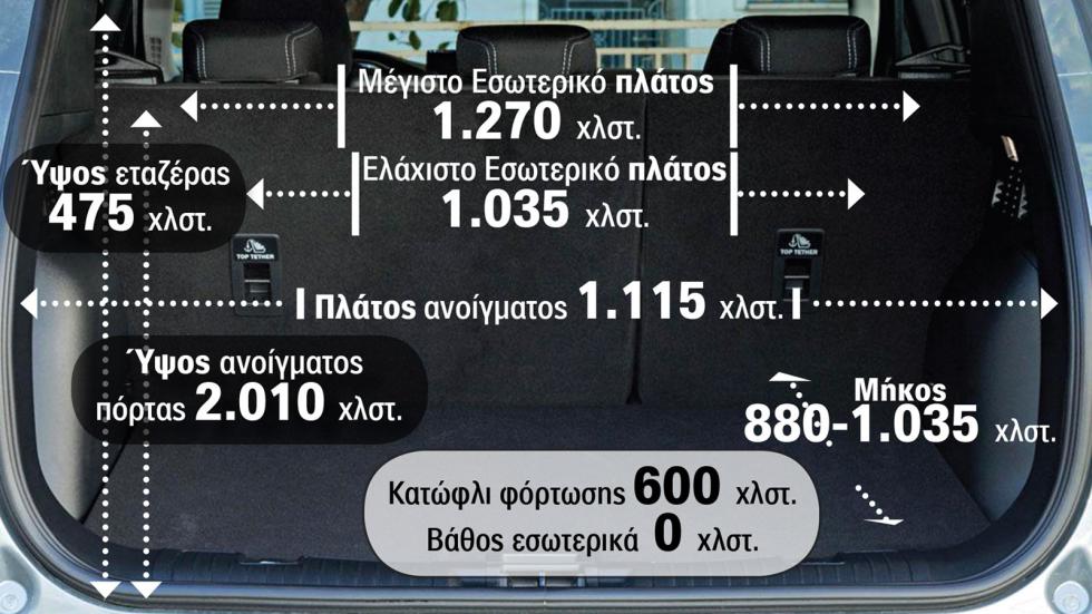 Πρέπει να αναφέρουμε ότι η μέτρηση έχει γίνει όχι στο μέγιστο (με τα καθίσματα μπροστά δηλαδή), αλλά σε σημείο όπου οι πίσω επιβάτες μπορούν να ταξιδέψουν άνετα. Δηλαδή σε ενδιάμεση θέση. Επιπλέον μετρήθηκε μόνο ο ωφέλιμος χώρος και όχι το σημείο όπου αποθηκεύεται το κιτ ελαστικού.