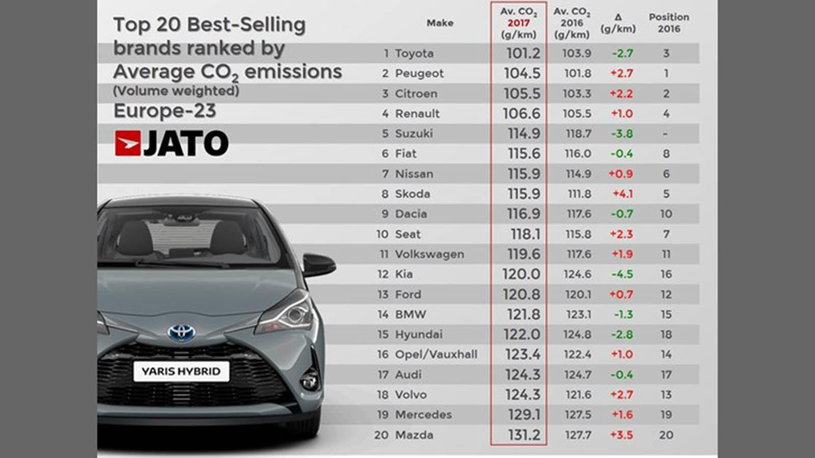 Οι πέντε μάρκες με τις μικρότερες εκπομπές ρύπων είναι κατά σειρά η Toyota, η Peugeot, η Citroen, η Renault και η Suzuki.
