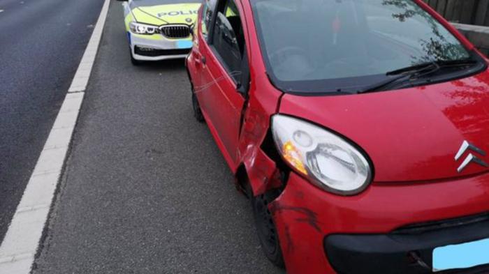 Υπήρξε πλήθος τηλεφωνημάτων σε κοντινό αστυνομικό τμήμα για ένα κόκκινο Citroen C1 που κινείται σε αυτοκινητόδρομο χωρίς ελαστικό στο πίσω δεξιά τροχό .