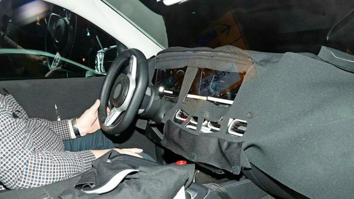 Στο εσωτερικό το καμουφλάζ δεν μας αφήνει να δούμε τη σχεδίαση του ταμπλό, ωστόσο αποκαλύπτει τις δύο μεγάλες οθόνες που έχουν τοποθετηθεί. Η μία αποτελεί τον πίνακα οργάνων και η άλλη φιλοξενεί το νέο σύστημα πληροφοριών και ψυχαγωγίας MBUX της Mercedes.