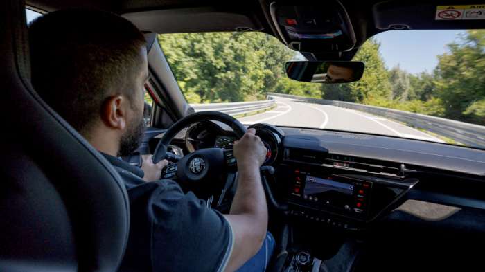 Από εκεί και πέρα, έξτρα αυτοπεποίθηση μας έδωσαν τα ακούραστα φρένα με τις 4πίστονες monobloc δαγκάνες και δίσκους 382 χλστ. μπροστά και 268 χλστ. πίσω σε μια προσπάθεια να φρενάρουμε πιο κοντά στην είσοδο της κάθε στροφής πριν στοχεύσουμε την κορυφή της, αν και η αίσθηση του πεντάλ επιδέχεται βελτιώσεων. Σημειώστε επίσης ότι οι Ιταλοί υπόσχονται φρενάρισμα από τα 100 χλμ./ώρα σε 35 μέτρα, κάτι που μένει να επιβεβαιώσουμε φυσικά αργότερα στις μετρήσεις του AutoΤρίτη Test Center στην Ελλάδα.