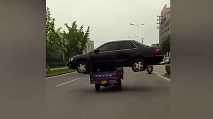 Tα πάντα για να μην πληρώσει κάποια παραπάνω χρήματα σε κάποια μεταφορική εταιρεία έκανε ένας άνδρας στην Κίνα που βιντεοσκοπήθηκε να μεταφέρει πανώ στο τρίκυκλο του ένα ολόκληρο αυτοκίνητο.