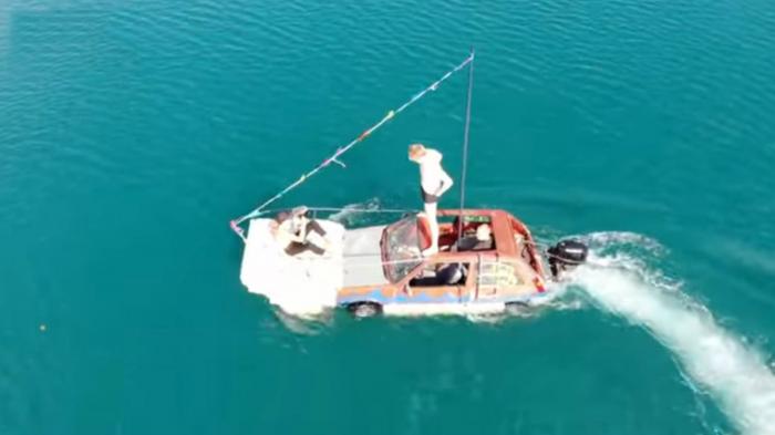 Στη συνέχεια ο δημιουργούς άρχισε να προσαρμόζει τις συσκευασίες των χυμών στο μπροστά μέρος για να ισοσταθμίσει το βάρος του κινητήρα, καλύπτοντας ταυτόχρονα τα κενά που δημιουργούνταν με αφρό, ενώ ενισχύει και τα πλαϊνά μέρη στις πόρτες προκειμένου να μην εισχωρήσει το νερό και το αμάξι αρχίζει να βουλιάζει. Τέλος προσθέτει στο πίσω μέρος και μία εξωλέμβια μηχανή και πλέον το μόνο που πρέπει να αποδειχτεί είναι η…. επιτυχία της μετατροπής.