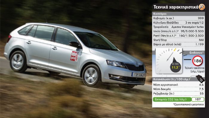 Η μεγάλη αλλαγή στο ανανεωμένο Rapid Spaceback αφορά στην αντικατάσταση του 4κύλινδρου 1,2 TSI κινητήρα με τον αντίστοιχο 3κύλινδρο 1,0 TSI. Στη βασική του έκδοση, όπως στο μοντέλο της δοκιμής, αποδίδει 95 ίππους (90 το βασικό 1,2 TSI) και την ίδια ροπή (160 Nm). Η συνεργασία με το 7άρι DSG κιβώτιο δίνει αρκετά καλές επιδόσεις και κυρίως γρήγορες ρεπρίζ χάρη στο kickdown. Tο 1.000άρι μοτέρ λειτουργεί ομαλά είναι και ανεβάζει πρόθυμα στροφές, ωστόσο στην καθημερινή οδήγηση το DSG έχει την τάση να κρατά χαμηλά τις στροφές για λόγους οικονομίας και παράλληλα αργεί κάπως να αποκριθεί στο πάτημα του γκαζιού. Η Skoda υπόσχεται μέση κατανάλωση 4,6 λτ./100 χλμ. στην πράξη όμως σε καμία περίπτωση αυτό το νούμερο δεν επιβεβαιώθηκε από τις μετρήσεις μας. Το αντίθετο μάλιστα μιας και οι μετρήσεις μας έδειξαν νούμερα γύρω από στα 7,5 λτ./100 χλμ..