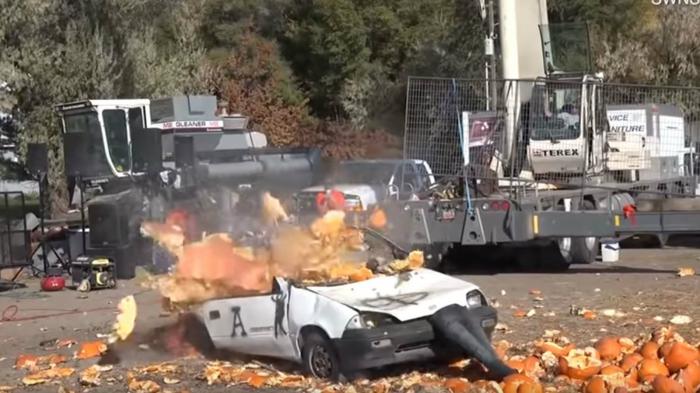 Βλέποντας το παρακάτω βίντεο θα διαπιστώσετε πως από τις κολοκύθες δεν γλίτωσε ούτε ένα παλιό αυτοκίνητο, το οποίο δέχτηκε στην οροφή από ύψος 53 μέτρων μία κολοκύθα βάρους 500 περίπου κιλών. Αν και το αμάξι ήταν τρακαρισμένο όπως και η οροφή, η ζημιά που έκανε το πέταγμα της κολοκύθας είναι πολύ μεγάλο, αφού ισοπέδωσε ότι είχε απομείνει.