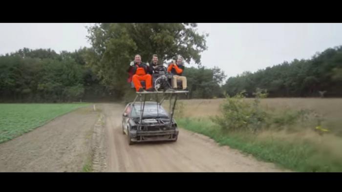 Όπως μπορείτε να δείτε μέσω μία σιδερένιας κατασκευής που είχε τη βάση της στο μπροστινό μέρος του αυτοκινήτου, οι ιθύνοντες της εκπομπής εγκατέστησαν τρία καθίσματα, ένα τιμόνι και πετάλια, όλα λειτουργικά και αποφάσισαν να πάνε μία βόλτα. Μάλιστα ιδιαίτερη ικανοποίηση φαίνεται να παίρνουν κατά τη διάρκεια των φρεναρισμάτων όπου το αυτοκίνητο σηκώνεται στις δύο ρόδες.