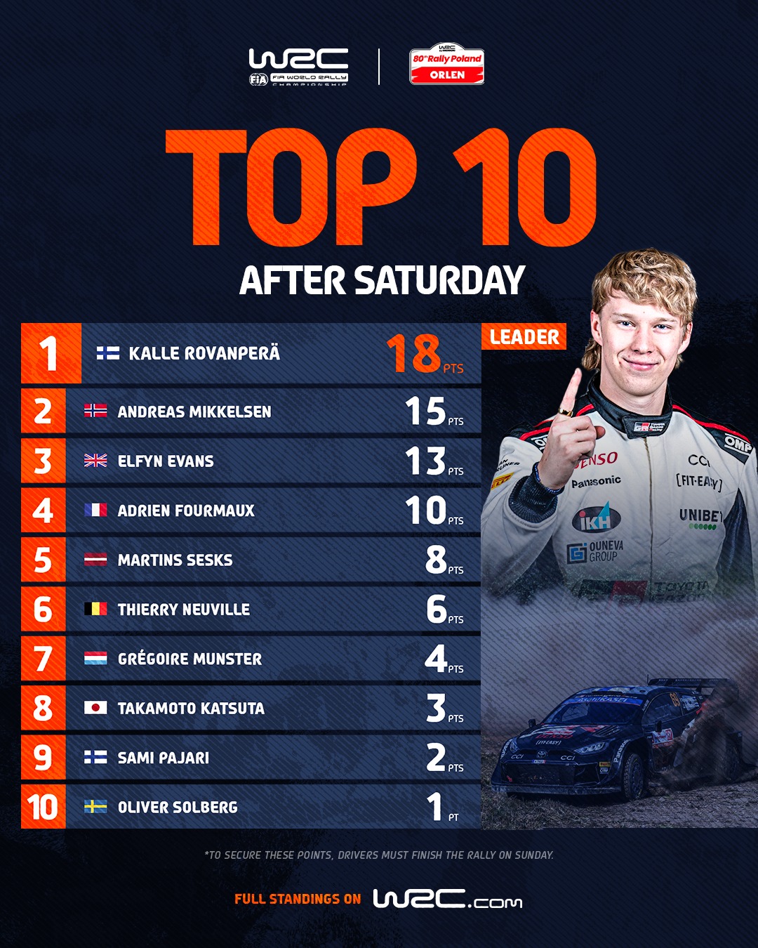 Ο Kalle Rovanprera δείχνει το αστείρευτο οδηγικό του ταλέντο στην Πολωνία, έναν αγώνα για τον οποίο δεν προετοιμάστηκε καθόλου καθώς κλήθηκε μερικά 24ωρα πριν την εκκίνηση να καλύψει το κενό του Sebastian Ogier. Σημειώστε πως ο τελευταίος ενεπλάκη σε τροχαίο ατύχημα στα δοκιμαστικά πριν τον αγώνα και δεν μπορούσε να συμμετάσχει για λόγους υγείας.