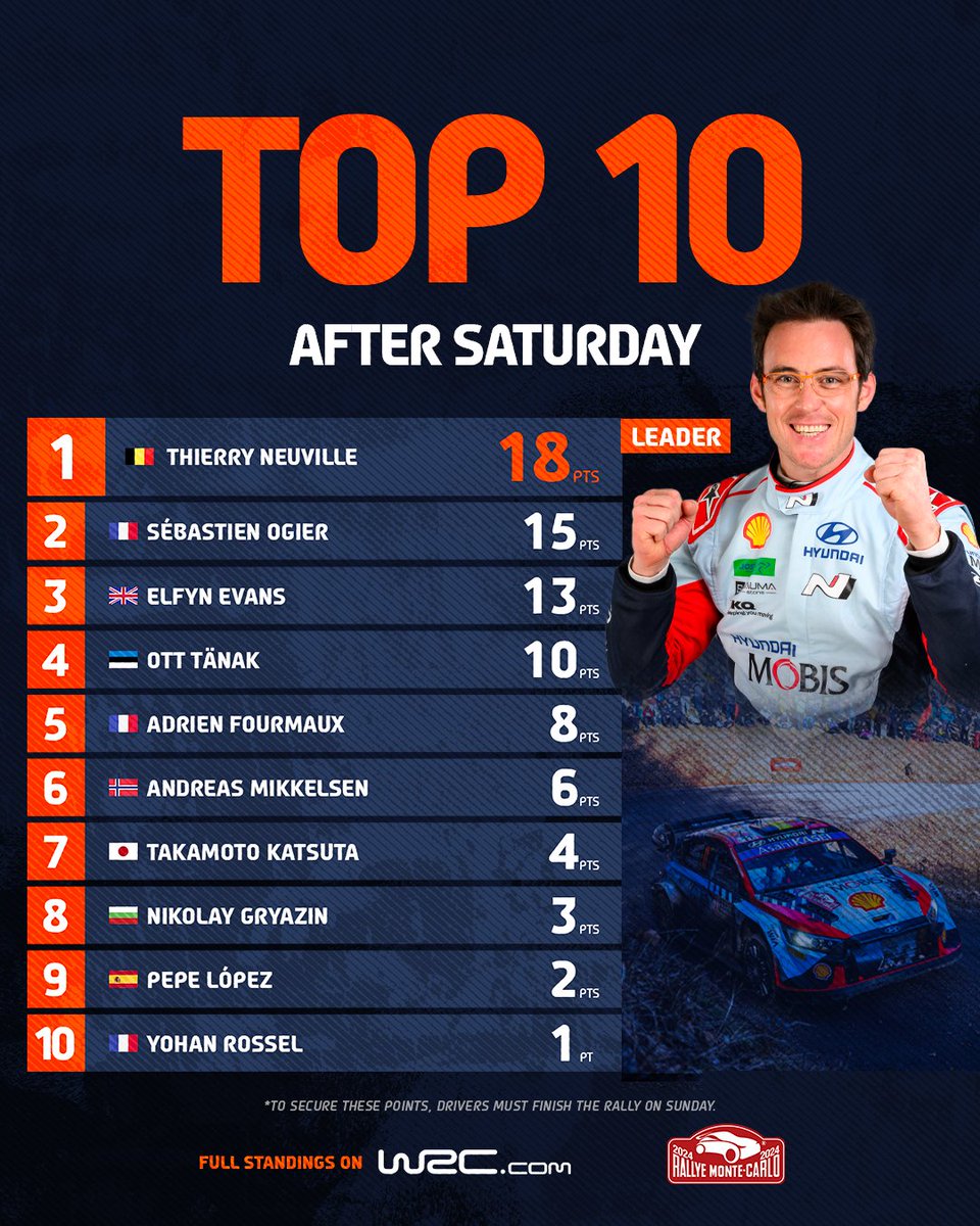 Πέρα από αυτά, το Rally Monte Carlo είναι ο αγώνας στον οποίο γίνεται το ντεμπούτο του νέου τρόπου για τον υπολογισμό των βαθμών, κάτι που σημαίνει πως ο Neuville θα φύγει με τους πρώτους 18 βαθμούς της χρονιάς στις αποσκευές του, εφόσον ολοκληρώσει τις ειδικές της Κυριακής. Αντίστοιχα, ο δεύτερος Ogier κερδίζει 15 βαθμούς, ενώ ο τρίτος Evans, ο οποίος αντιμετώπισε πρόβλημα και με το υβριδικό σύστημα του Yaris, θα λάβει 13 βαθμούς.