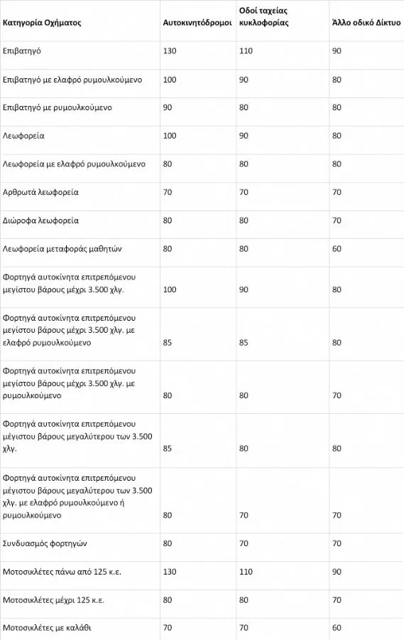 Ενιαία όρια ανάλογα το δρόμο (πχ. κατοικημένες περιοχές) και τον τύπο του οχήματος
