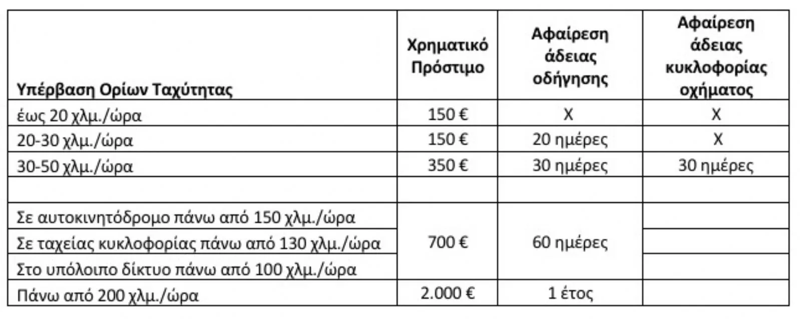 Αν τώρα κάποιος ξεπεράσει το όριο κατά 50+ χλμ./ώρα, θα κληθεί να πληρώσει 700 ευρώ πρόστιμο και θα χάσει το δίπλωμά του για 2 μήνες. Τέλος, στην περίπτωση που κάποιος πηγαίνει με πάνω από 200 χλμ./ώρα τότε θα κληθεί να πληρώσει 2.000 ευρώ πρόστιμο και θα χάσει το δίπλωμά του για 1 χρόνο, ενώ θα οδηγηθεί και στο αυτόφωρο.