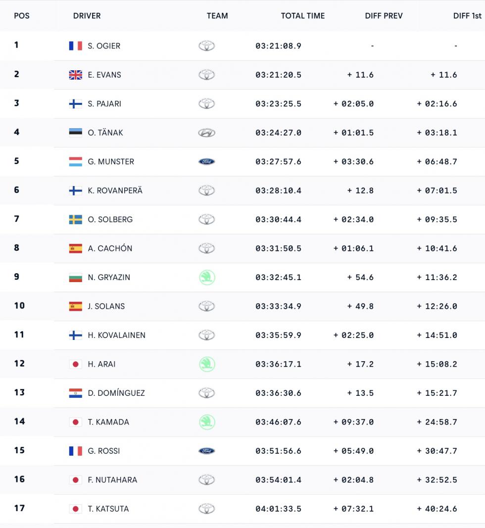 Ο Sebastian Ogier κατάφερε να αποκρούσει την πίεση που άσκησε ο teammate του στην Toyota Gazoo Racing και πρωτοπόρος της βαθμολογίας, Elfyn Evans, στο βροχερό τελευταίο σκέλος, κερδίζοντας με 11,6 δευτερόλεπτα ενώ παράλληλα μείωσε τη διαφορά στο πρωτάθλημα οδηγών στους τρεις βαθμούς. Ο Evans ξεκίνησε την ημέρα 6,5 δευτερόλεπτα πίσω και αρχικά φαινόταν έτοιμος να αντεπιτεθεί καθώς «προσπέρασε» τον Γάλλο κατά 0,8 δευτερόλεπτα στην πρώτη ειδική της ημέρας Nukata, προτού ο Ogier ανακτήσει τον έλεγχο στην επόμενη ειδική στη λίμνη Mikawako.